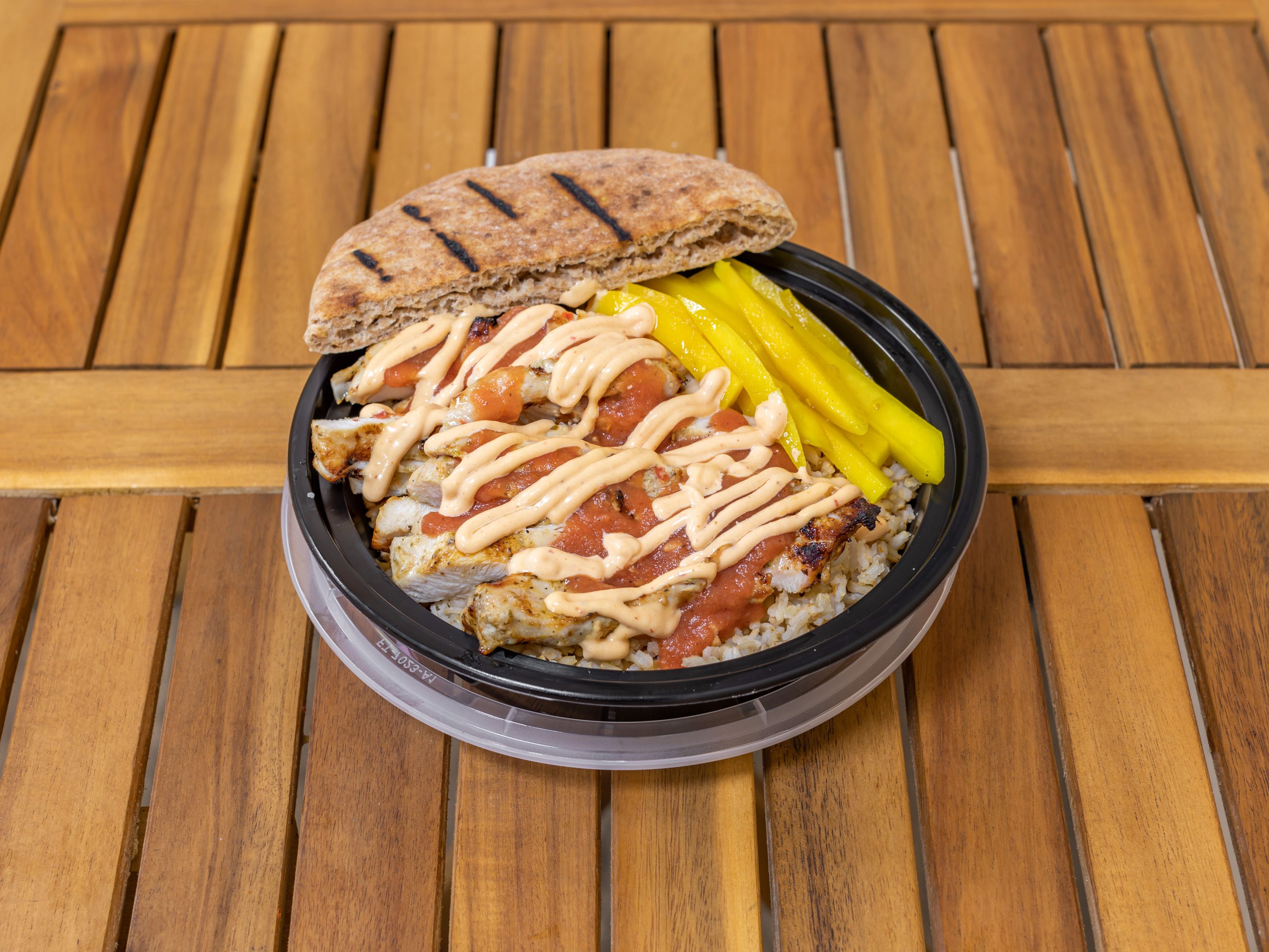 Kosher Chicken Breast, Mediterranean marinade, Chipotle Mayonnaise, Roasted tomato Sauce, Pickled Mango, Carrot Salad, 1/2 pita