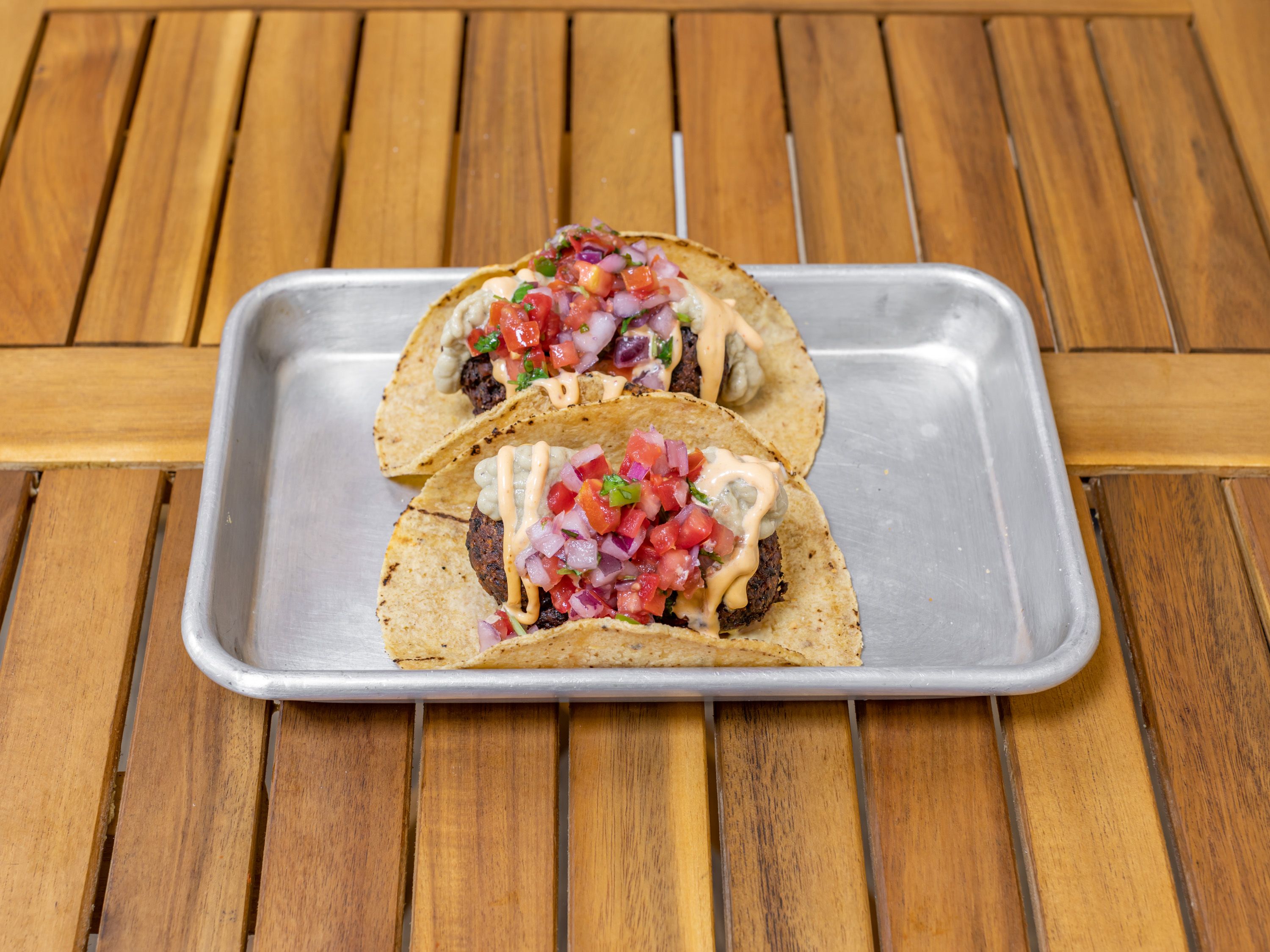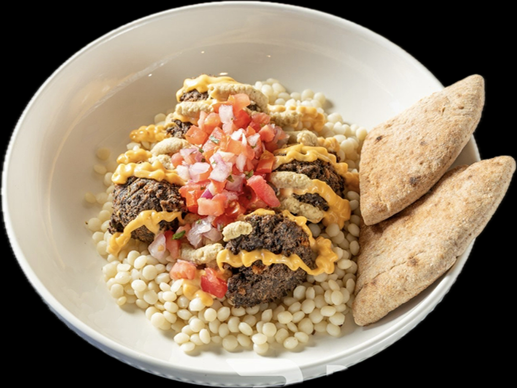 Black bean falafel with roasted eggplant babaghanoush, Israeli salad, hummus and tahini. Choice of pita, flour tortilla, or corn tortilla tacos (gluten-free). Vegan, Mexican-Israeli fusion handheld, Kosher