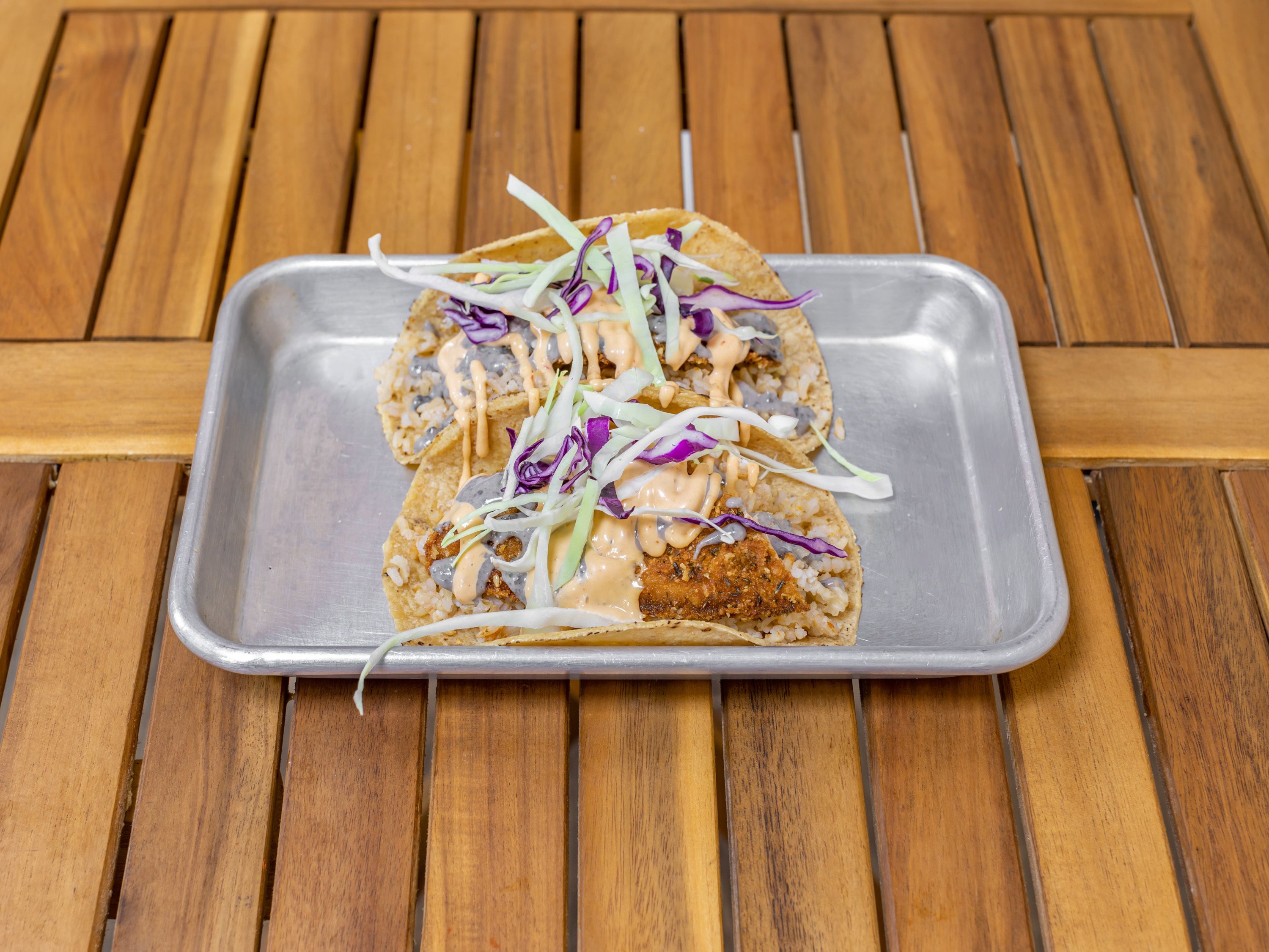 Crispy Tilapia, Mexican Brown Rice, Pico De Gallo, Chipotle Mayonnaise, Crunchy Cabbage Choice of pita, flour tortilla, or corn tortilla Tacos (gluten-free). Mexican handheld