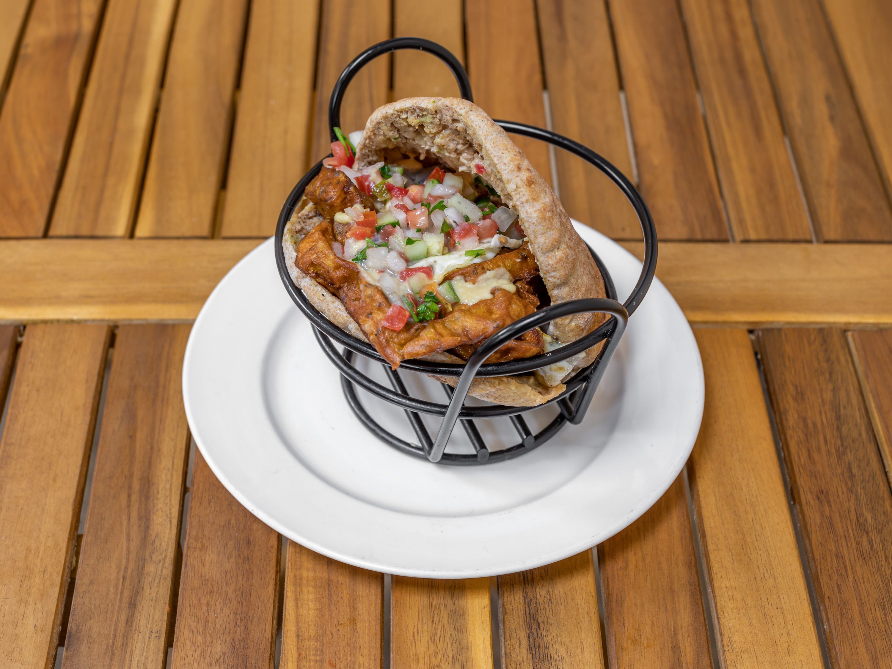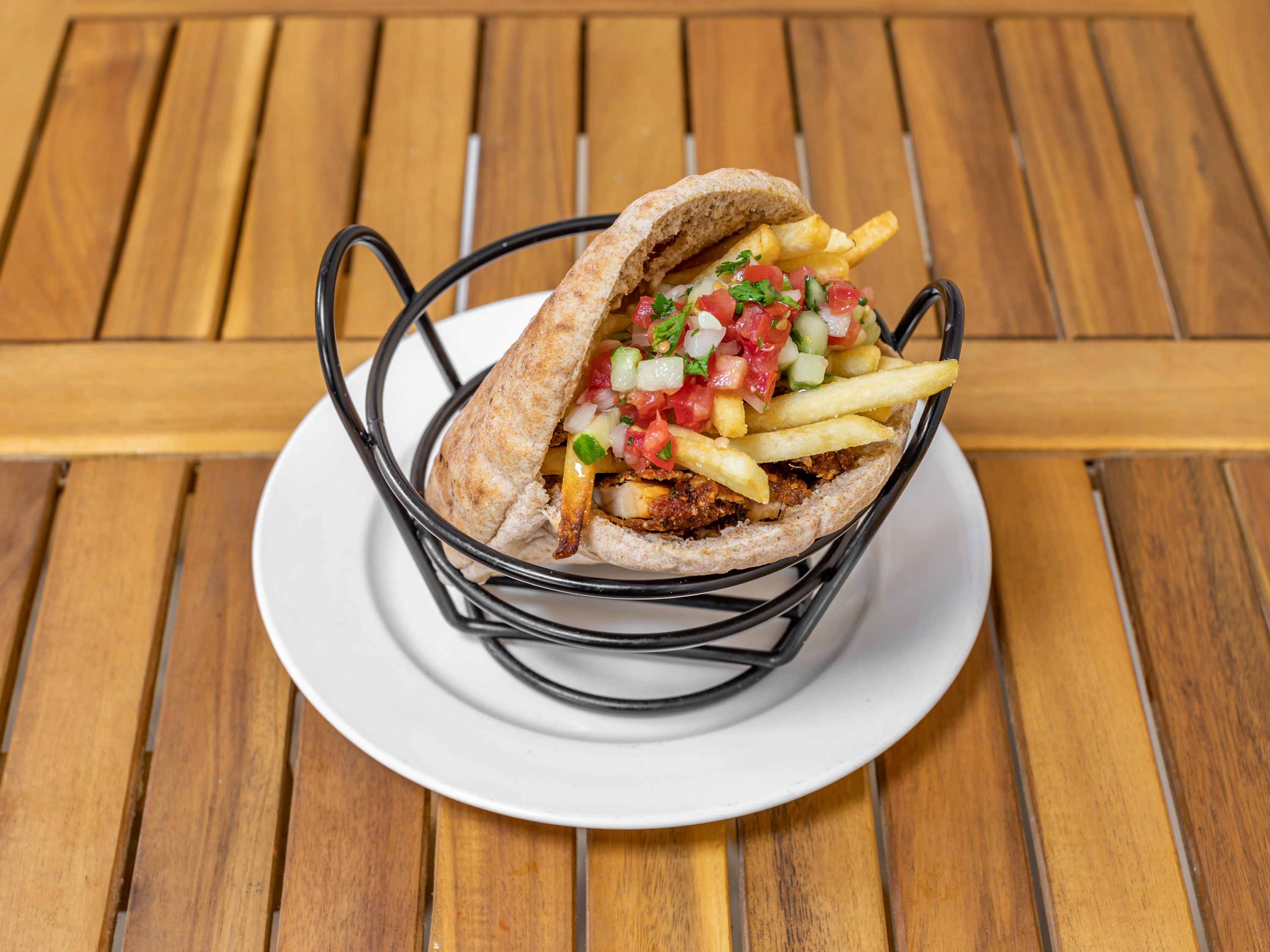 Crispy chicken schnitzel French Fries inside, Israeli salad, hummus and tahini. Choice of pita, flour tortilla, or corn tortilla Tacos (gluten-free). Mediterranean handheld.