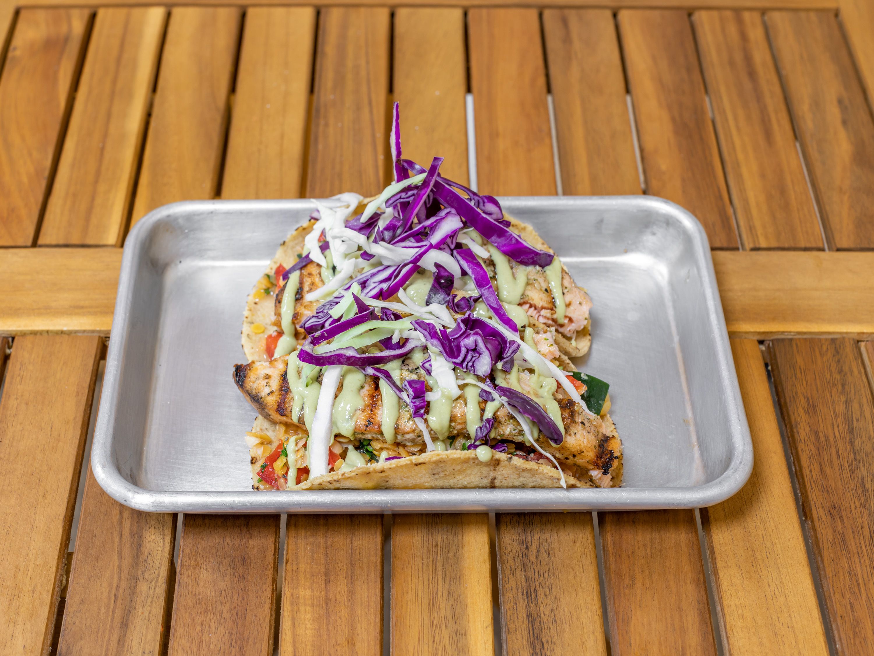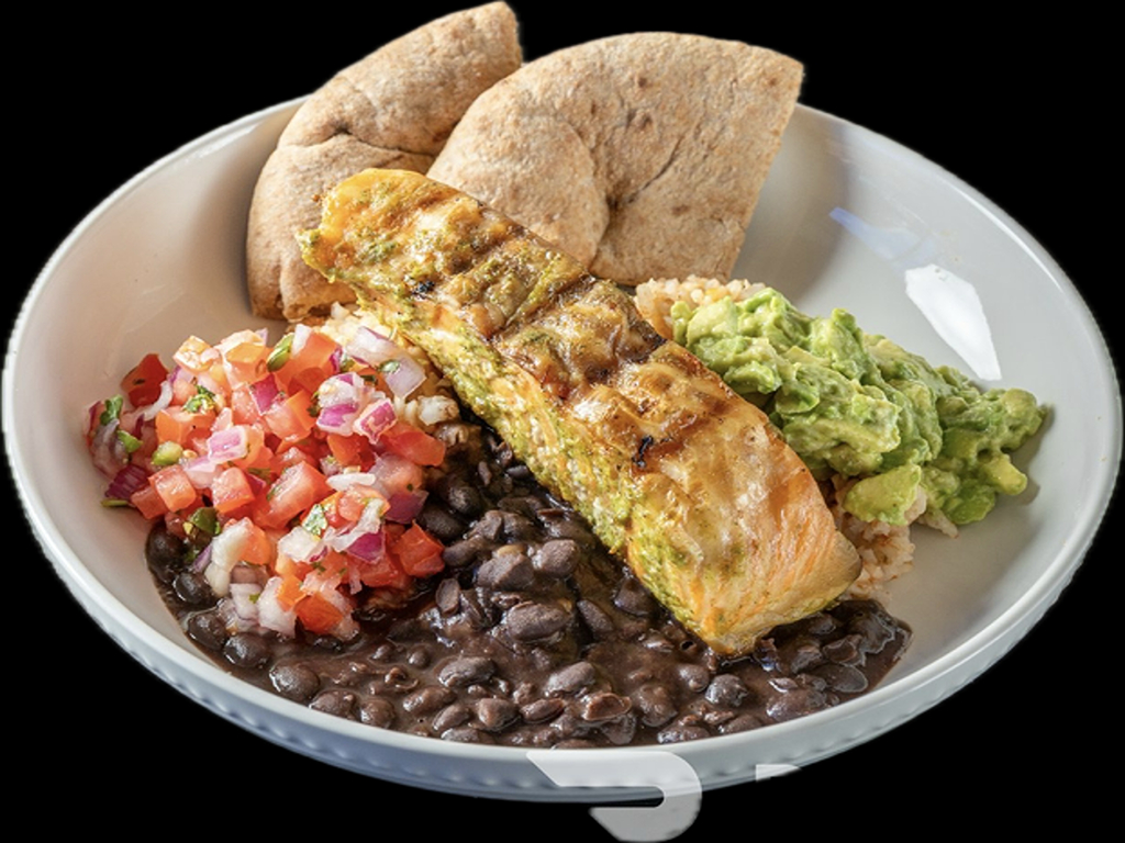 Grilled Atlantic salmon, rice, beans, Pico de Gallo, Avocado Hummus. Choice of pita, flour tortilla, or corn tortillas tacos (gluten-free). Healthy Mexican handheld, Kosher
