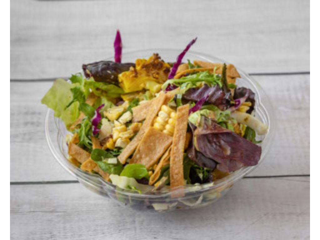 Roasted Corn, Shredded Cabbage, Za'tar Roasted Cauliflower, Mixed Greens, Brussels Sprouts, Pomegranate Dressing Mix in, Tortilla Strips