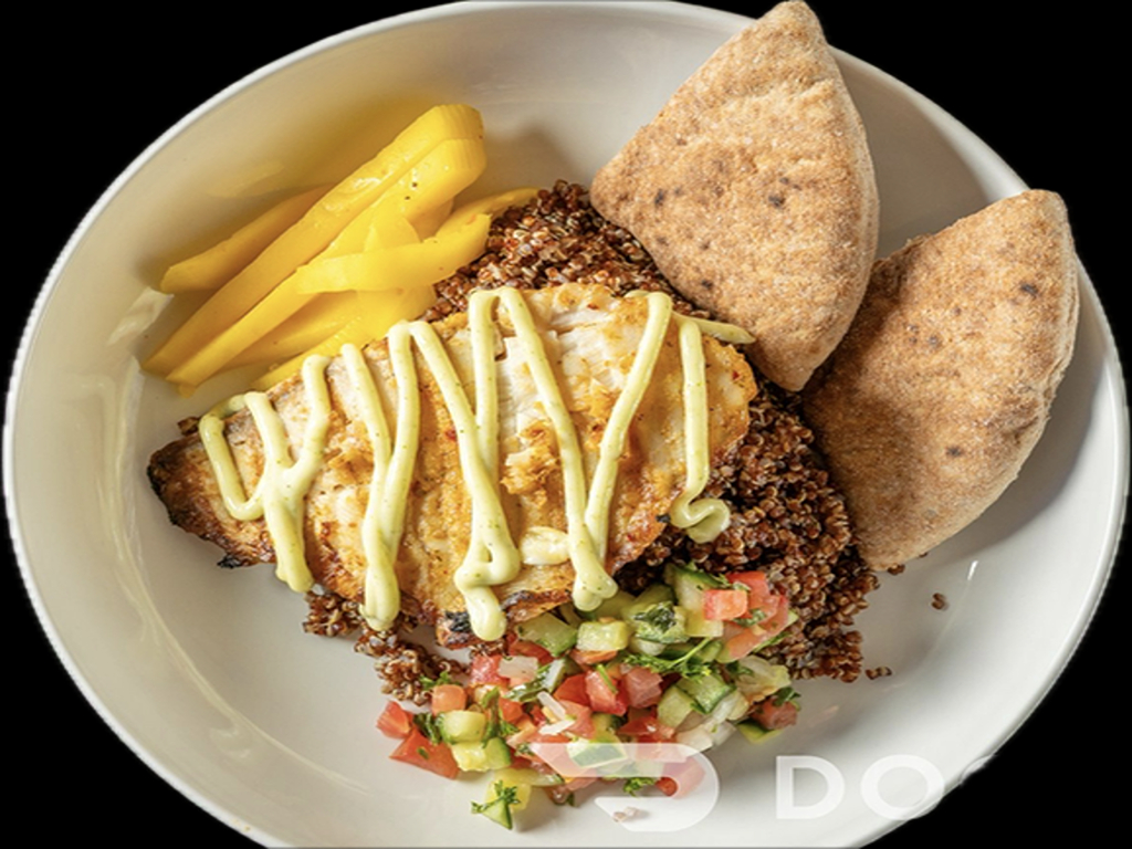 Grilled Tilapia, Mediterranean Marinade, Zhug Mayonnaise, Israeli Salad, Pickled Mango, 1/2 pita