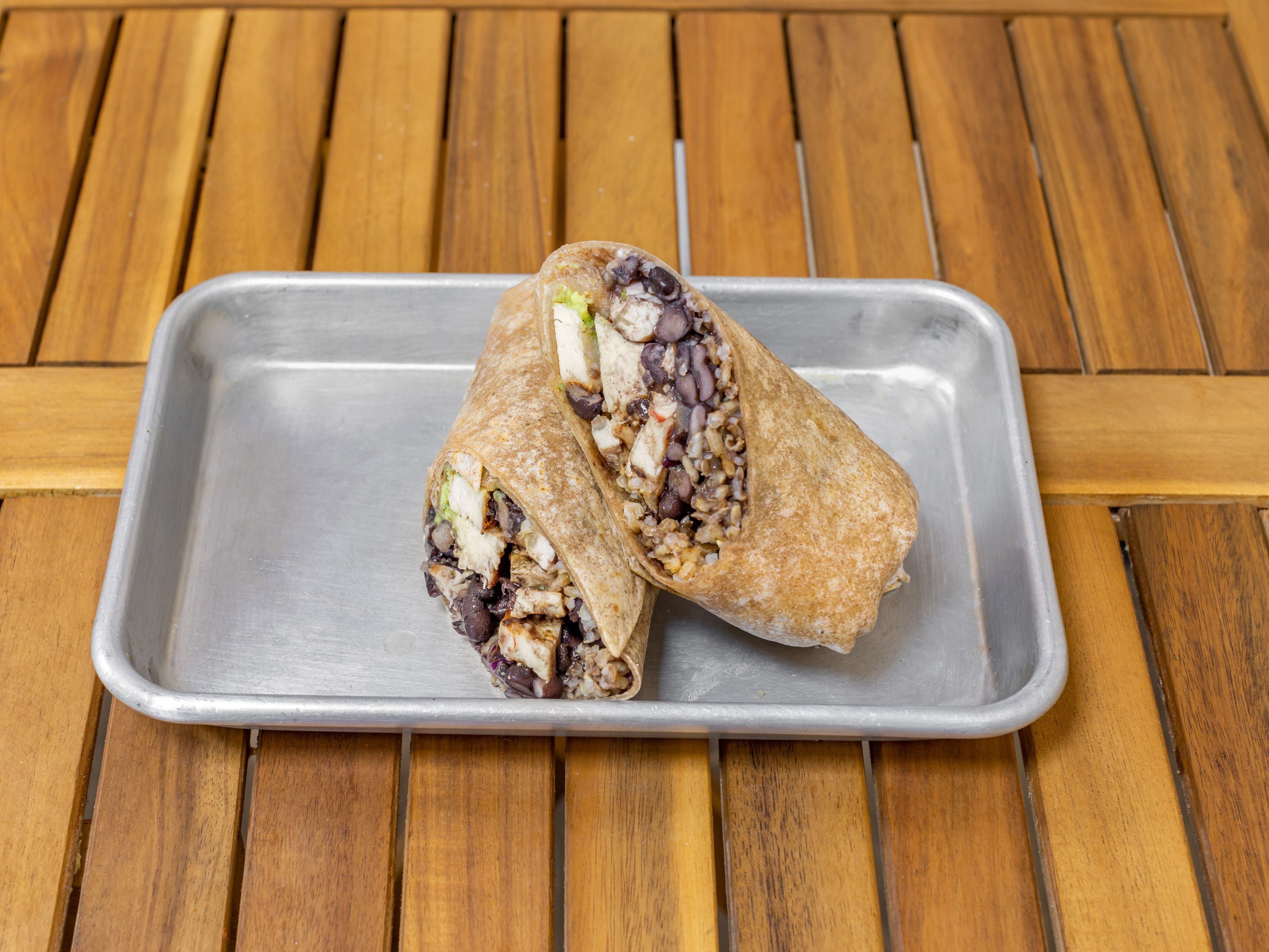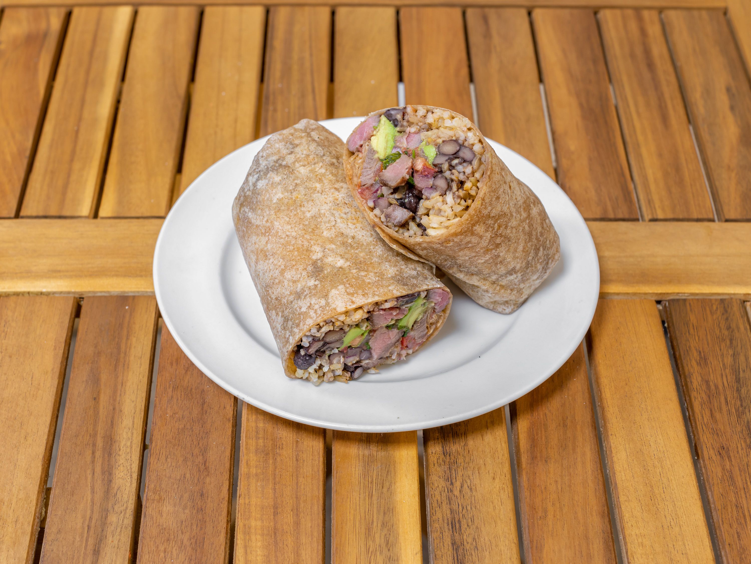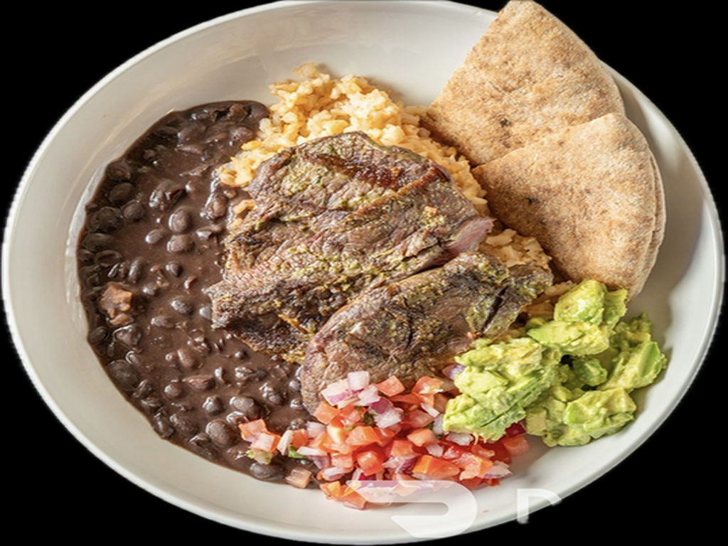 Grilled steak, Mexican Brown Rice, Black Beans, Pico de Gallo, Avocado Hummus. Choice of pita, flour tortilla, or corn tortillas (gluten-free). Mexican handheld, Kosher