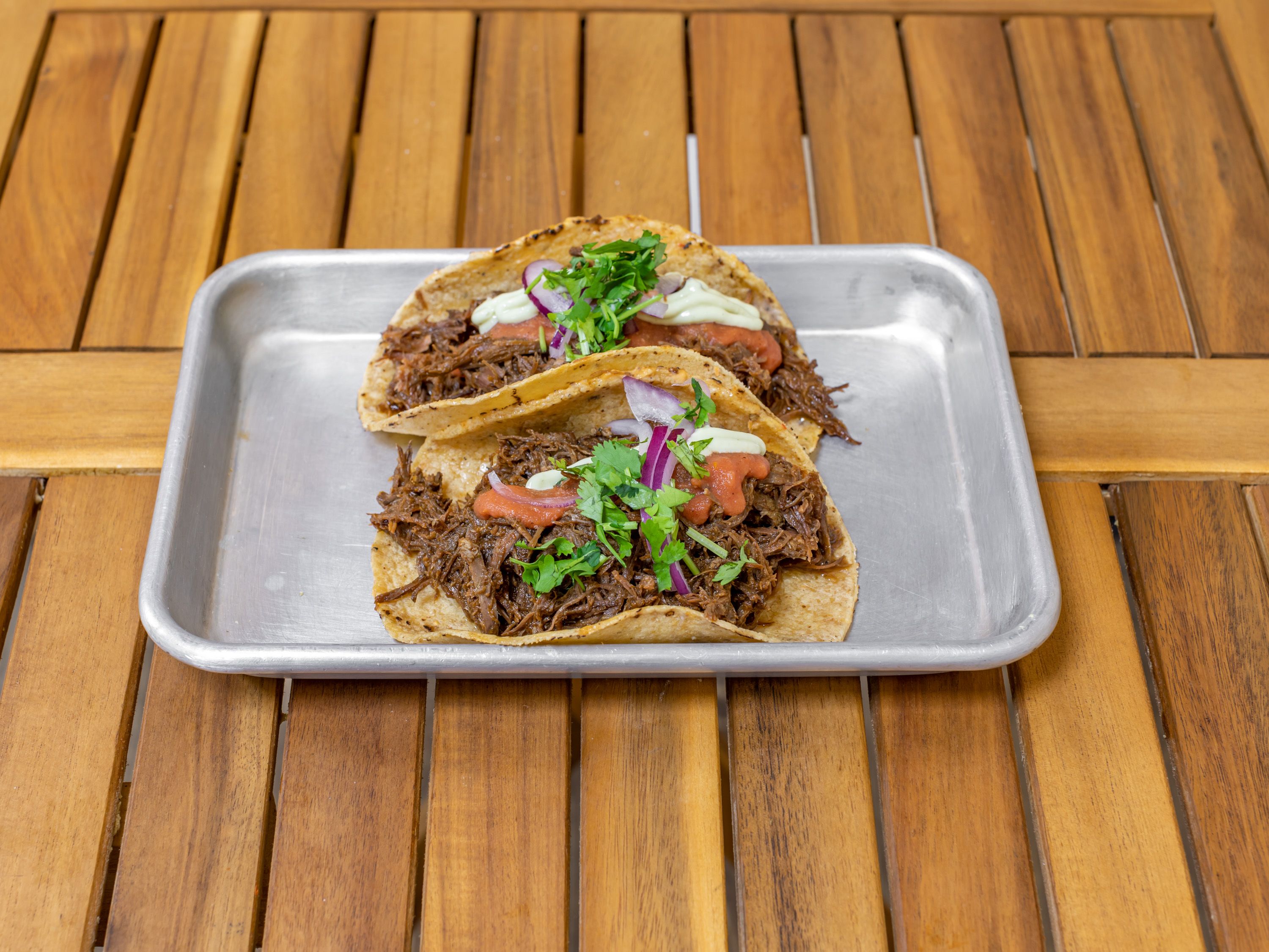 Slow-braised shredded brisket with roasted tomato salsa, cilantro and onions. Choice of pita, flour tortilla, or corn tortillas tacos (gluten-free). Mexican-Israeli fusion handheld, Kosher