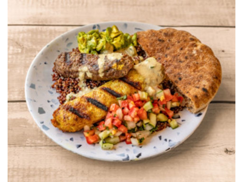 Fresh Ground Kosher Chipotle Beef, Fresh Ground Kosher Chicken Shawarma, Tahini, Israeli Salad, Avocado Hummus
