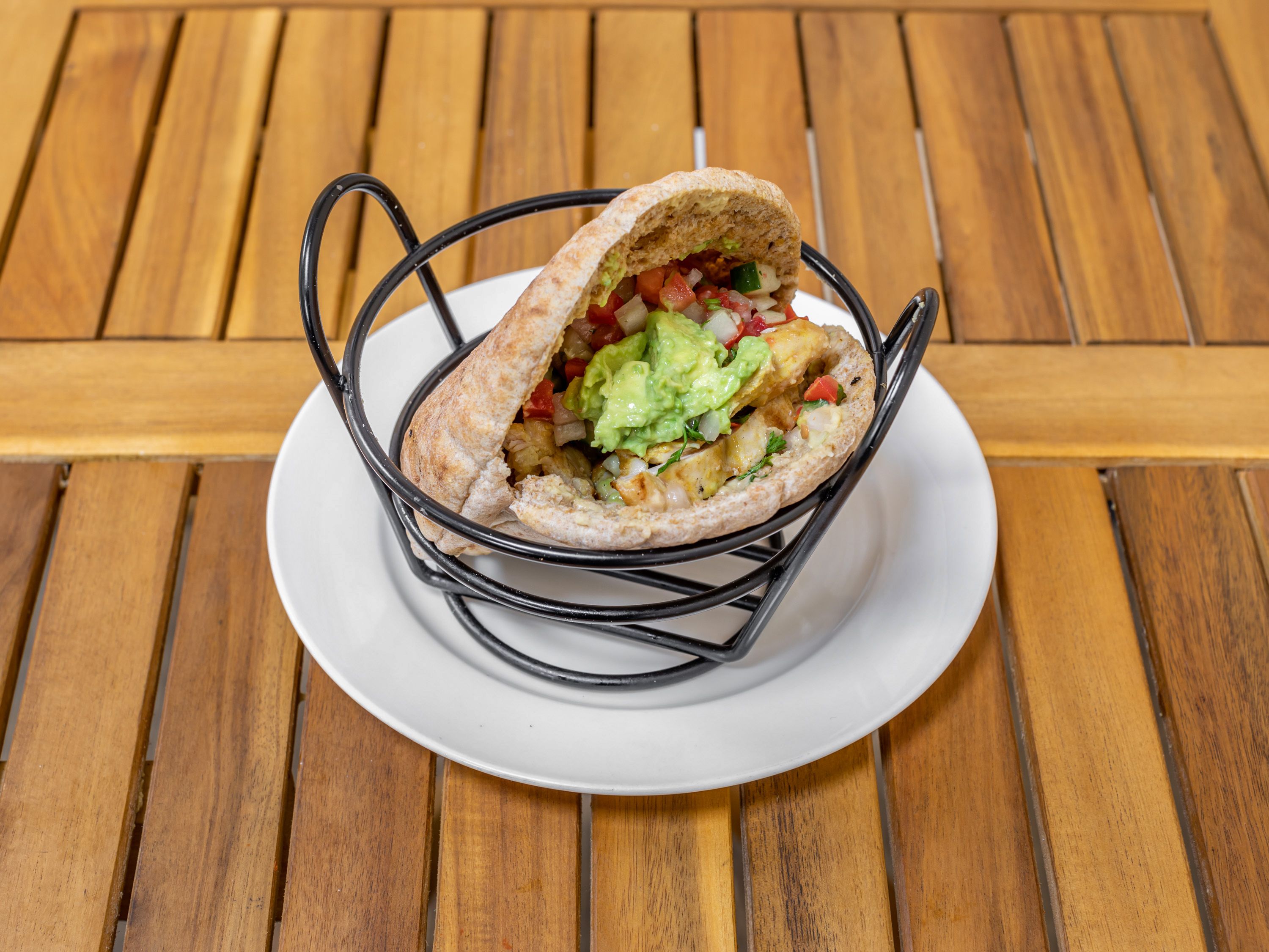 Marinated chicken shawarma with Israeli salad, tahini and Avocado Hummus. Choice of pita, flour tortilla, or corn tortilla tacos (gluten-free). Mexican-Israeli fusion, kosher.