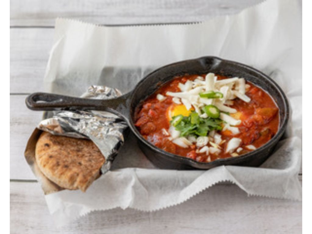 Tomatoes, Onions, Peppers, Garlic, Spices, Eggs, Plant Based Cheese, Onions, Cilantro, Serrano Peppers, 1/2 pita
