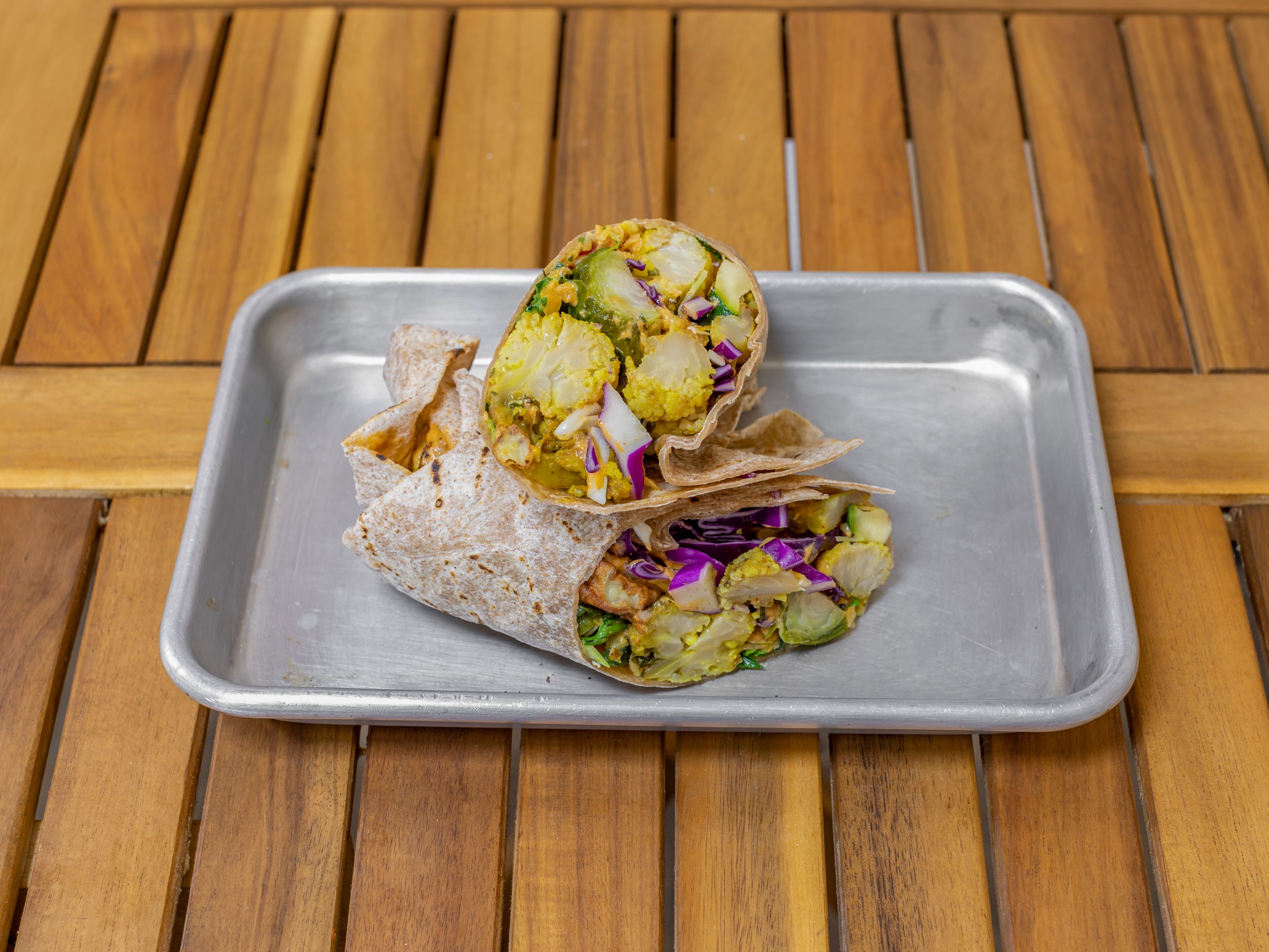 Roasted Za'tar Cauliflower, Brussel Sprouts, Grilled Zucchini, Fried Eggplant, Mexican Brown Rice, Black Beans, Chipotle Tahini, Crunchy Cabbage. Choice of pita, flour tortilla, or corn tortilla Tacos (gluten-free). Healthy Mexican-Mediterranean, Kosher Vegan Mediterranean handheld.